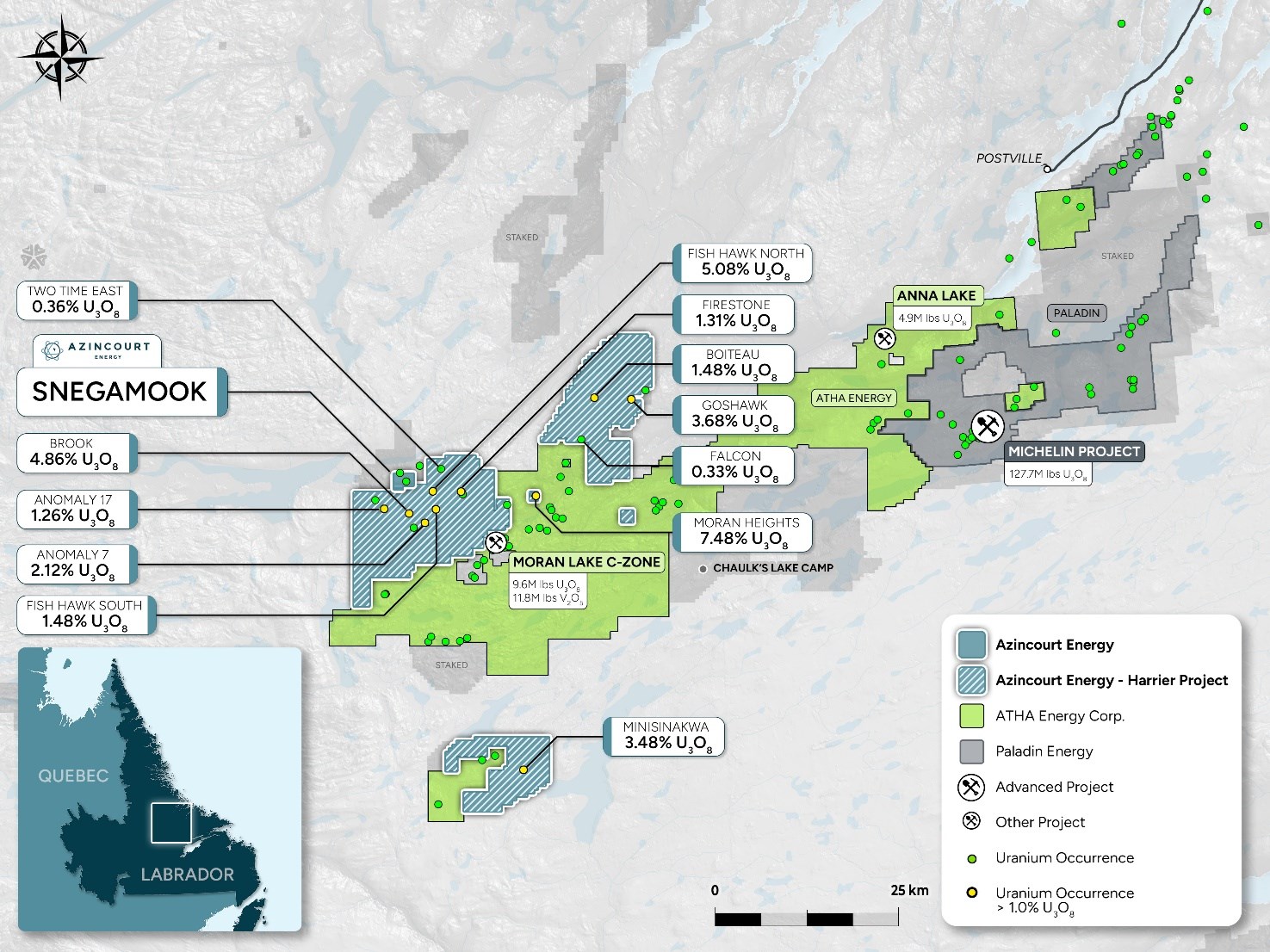 Azincourt is a Canadian-based resource company specializing in the strategic acquisition, exploration, and development of alternative energy/fuel projects, including uranium, lithium, and other critical clean energy elements. The Company is currently active at its East Preston uranium project located in the Athabasca Basin, Saskatchewan, and its Snegamook and Harrier uranium projects, located in the Central Mining Belt of Labrador.