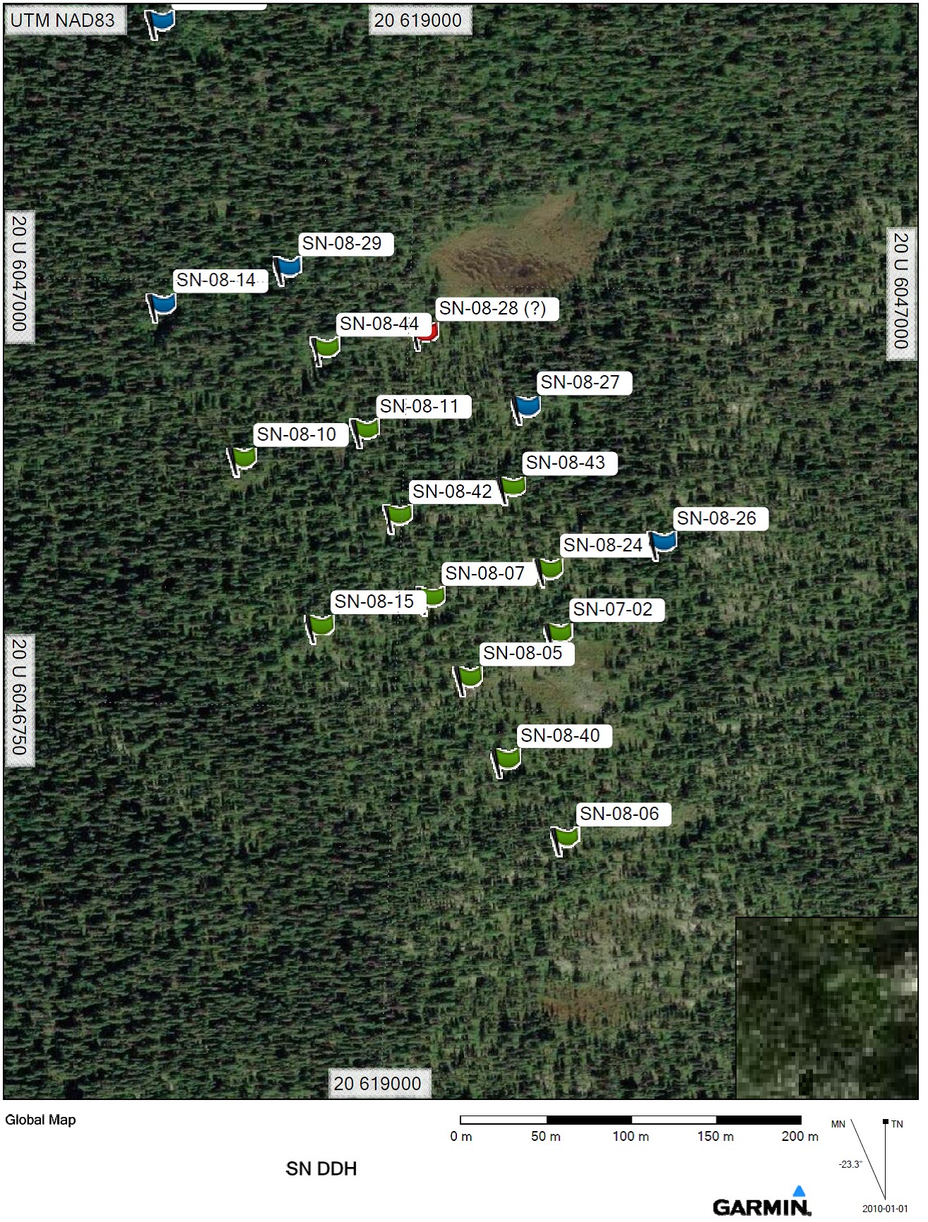 In the Snegamook Deposit area, the location of the drill core from the 2007-2008 exploration programs was confirmed at the old camp site used by Silver Spruce Resources. Much of the core is in decent shape considering it has been exposed to the elements for almost 20 years. Several drill holes that intersected the Snegamook Deposit mineralization and Snegamook Southeast showing were examined and a few samples were collected to confirm uranium grades. Reconnaissance of the deposit area was undertaken to examine ground conditions for future drilling and examine the old drill pads for confirmation of hole numbers, locations, and hole orientation. Many drill pads were easily recognizable and marked with casings. Metal tagged wooden posts were present at many sites allowing easy confirmation of the hole numbers.